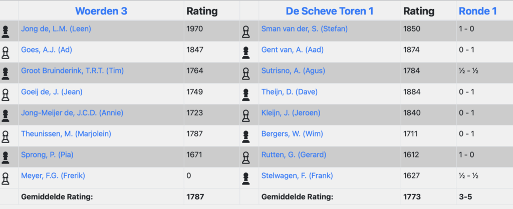 De samenstelling van Woerden 3 is enigszins gewijzigd ten opzichte van verleden jaar: Sarah-Joy en Jens verlieten ons, Ad en Leen kwamen erbij. Daarmee werd zowel de gemiddelde rating als de gemiddelde leeftijd van dit team wat hoger. Twee van onze basisspelers konden niet meedoen: Jordy werd vervangen door Pia en Sjaak door Frerik.