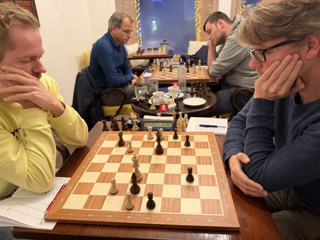 Olger van Donk had in de openingsfase tegen Andries Mellema wat onzorgvuldig een pion cadeau gedaan. Voor Olger was het toen uren lang achter de feiten aanlopen. We gaven weinig voor de kansen van Olger. Maar Olger bleef hardnekkig verdedigen en tegen het einde, toen beide spelers nog louter op hun increment aan het spelen waren, gloorden er zelfs nog remise kansen aan de horizon. Het probleem was dat Andreis allemaal mat netjes in de stelling zat te weven en met zo weinig tijd op de klok is het lastig daartegen verdedigen. En op een gegeven moment sloot het net zich om Olger zijn koning.