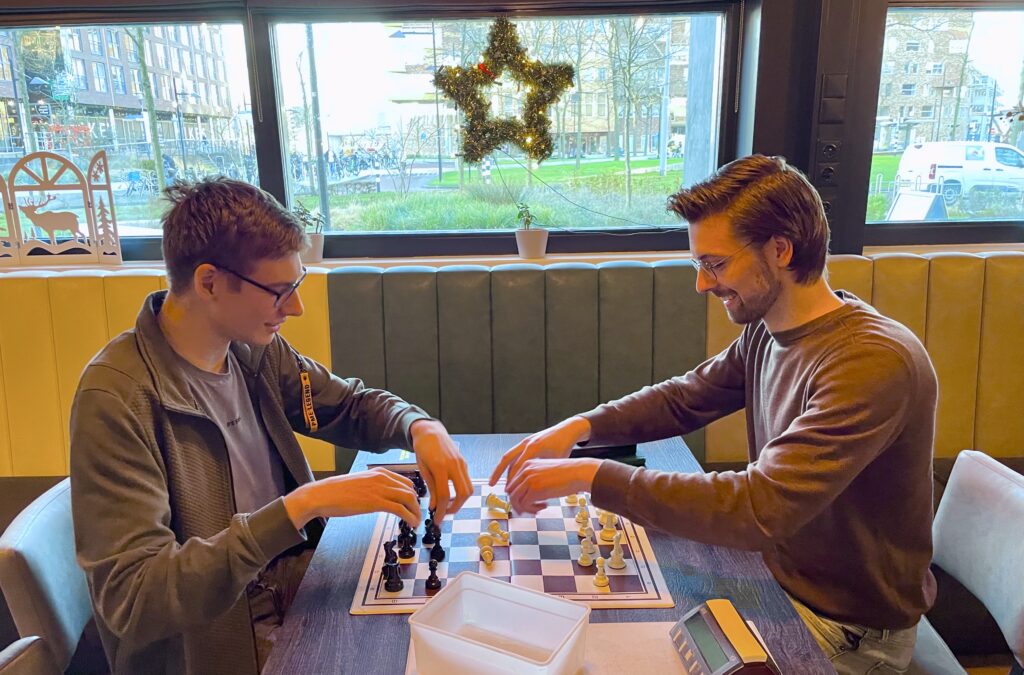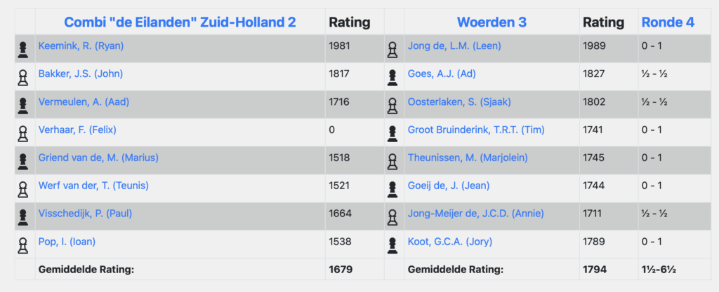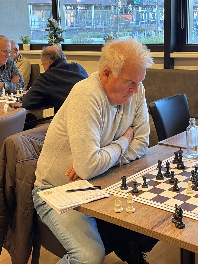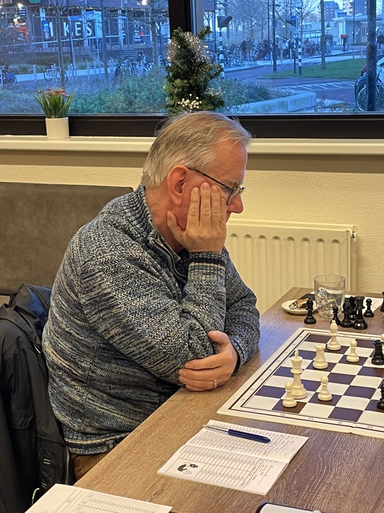 Marjolein was als eerste klaar. Met wit kwam ze steeds beter te staan omdat haar tegenstander te afwachtend speelde. Onder het genot van een flinke ontwikkelingsvoorsprong, hegemonie in het centrum en een venijnige koningsaanval maakte ze het met een aardige tactische wending fraai uit. Toen ze om vier uur terugkwam van wat kerstboodschappen in het naburige winkelcentrum, bleek de overwinning van het team al binnen te zijn.